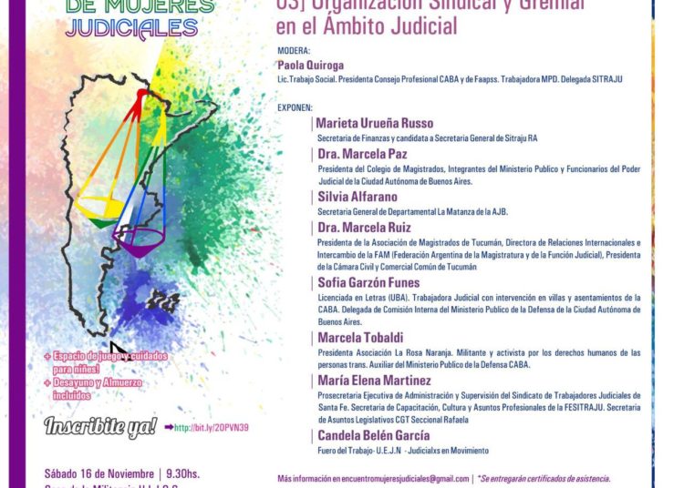 La Federación de Sindicatos de Trabajadores Judiciales de la República Argentina (FE-SITRAJU/CGT) realizará el Primer Encuentro Federal de Mujeres Judiciales el sábado 16 de noviembre en la sede de la Casa de la Militancia de H.I.J.O.S. Espacio Memoria y Derechos Humanos (Ex ESMA). Se esperan trabajadoras judiciales, magistradas y funcionarias de todo el país.