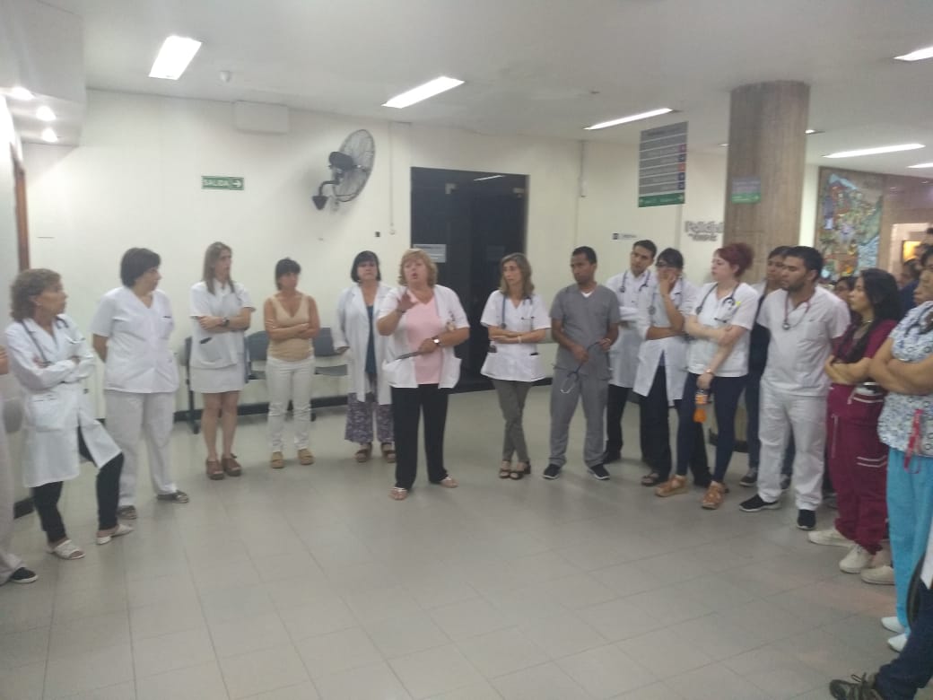 “No tenemos paritarias, están frenadas desde marzo de 2018, y estamos cobrando el sueldo en forma desdoblada o en cuotas desde diciembre del año pasado. Por ahí nos pagan una parte, como paso ahora, que el 6 de abril nos pagaron 10.000 pesos más 4200 pesos de un plan preventivo de crisis. Y otros 10 mil pesos el 30 de abril. Recién cobramos todo el sueldo de marzo. Ya tendríamos que estar cobrando abril, estamos en la primera semana de mayo”, narró la coordinadora de guardia del Policlínico del Docente.