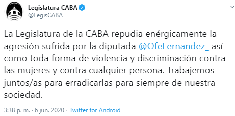 Ante esta situación la joven diputada tuvo el apoyo de la Legislatura Porteña, que se sumó al repudio de las agresiones que suele recibir, como de todas las formas de violencia y discriminación contra las personas. Por su parte, el bloque del Frente de Todos porteño emitió el mismo viernes 5 de junio un comunicado en el que expresó que estas agresiones son obra de “oscuros personajes” que reaccionan ante la transformación cultural de nuestra sociedad, la cual pretenden disciplinar.