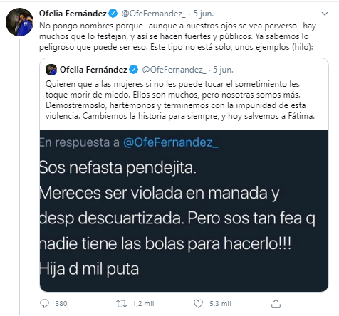 El pasado 5 de junio la diputada porteña Ofelia Fernández dio a conocer la violencia en línea, o tecnoviolencia, y la violencia política que sufre sistemáticamente. Mientras reclamaba a través de su cuenta de Twitter por la prórroga de la prisión preventiva del agresor de Fátima, víctima de violencia de género, recibía mensajes violentos como los que le llegan a diario. Su reacción fue hacer públicas algunas de estas agresiones.
