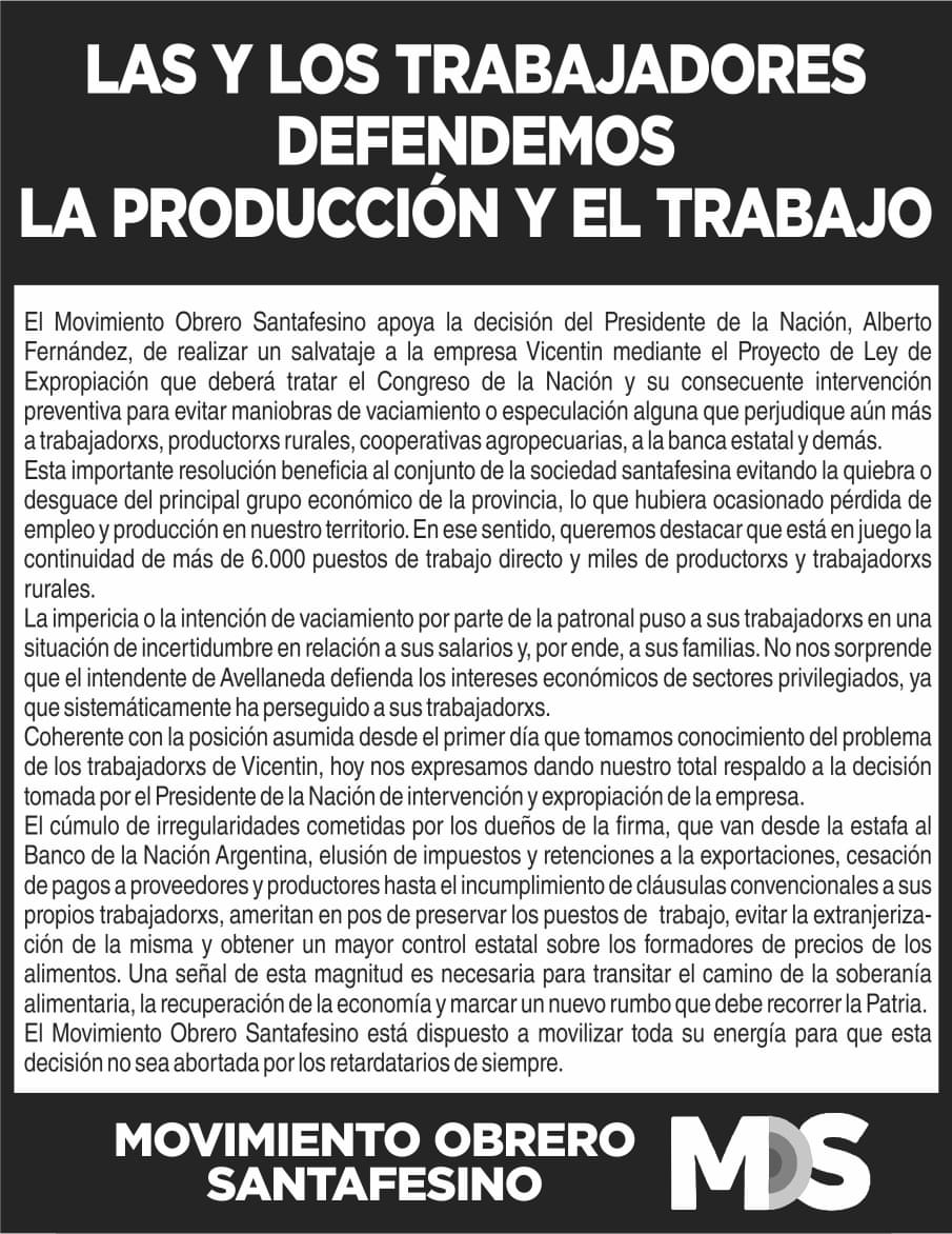 En la práctica, “Vicentín es dueño de la municipalidad de Avellaneda”. El referente comentó que como sindicato de trabajadores municipales se acaba de lograr que luego de mucho tiempo la justicia le diera la razón y reincorporara al empleado municipal Alfredo Sosa ante el despido arbitrario del intendente Scarpín. “Ponen muchos recursos en las campañas políticas porque aquí tienen su principal tierra, es su estancia, por eso tienen que tener un capataz, como es el intendente. Es lamentable lo que está pasando, el intendente le descontó los días a los trabajadores que pararon. Tiene trabajadores en la precariedad laboral, más de 150 compañeros que están en esas condiciones y no pueden hablar, que tienen temor y muchas veces son amenazados“. Numerosas organizaciones se han manifestado en favor de la expropiación en la provincia. Sobre todo en la región más importante a nivel económico, que es el sur de Santa Fe por su desarrollo industrial y comercial, hay amplio consenso para que el Estado se hiciera cargo.