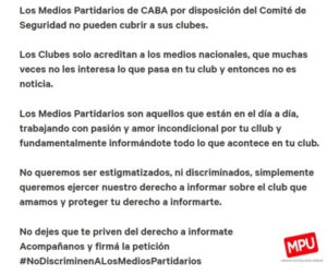 En Abrí la Cancha entrevistaron a Pacho Cerpa, referente de Medios Partidarios Unidos, quién calificó de discriminadora la medida tomada por el gobierno porteño: “Es una arbitrariedad del gobierno porteño. Aluden que se camuflan barras bravas detrás de los micrófonos pero detrás se esconde un plan de estigmatización. Una situación discriminatoria ya que no permiten acreditar a ningún medio que no sea de alcance nacional. Pero estos medios no le brindan cobertura a las categorías que no entienden rentable. Medios Partidarios Unidos nació con la imposibilidad de ingreso de los hinchas visitantes. Recuerdo que en el ascenso esto sucede desde 2007. Ahora prohíben el ingreso de los periodistas. ¿Qué fútbol quieren las autoridades de la seguridad?”