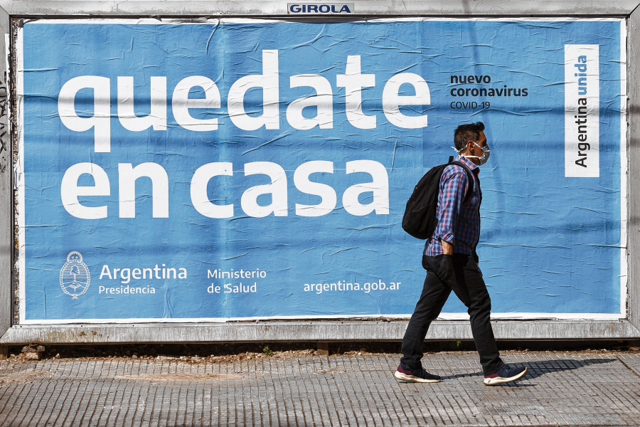 (200324) -- BUENOS AIRES, 24 marzo, 2020 (Xinhua) -- Un hombre portando una mascarilla camina frente a un cartel que insta a la población a quedarse en sus casas durante la cuarentena, en la ciudad de Buenos Aires, capital de Argentina, el 24 de marzo de 2020. El Ministerio de Salud de Argentina elevó el lunes a 301 los casos confirmados de la enfermedad causada por el nuevo coronavirus (COVID-19) en el país, de los cuales 51 se recuperaron y cuatro fallecieron. (Xinhua/Martín Zabala) (mz) (jg) (vf)