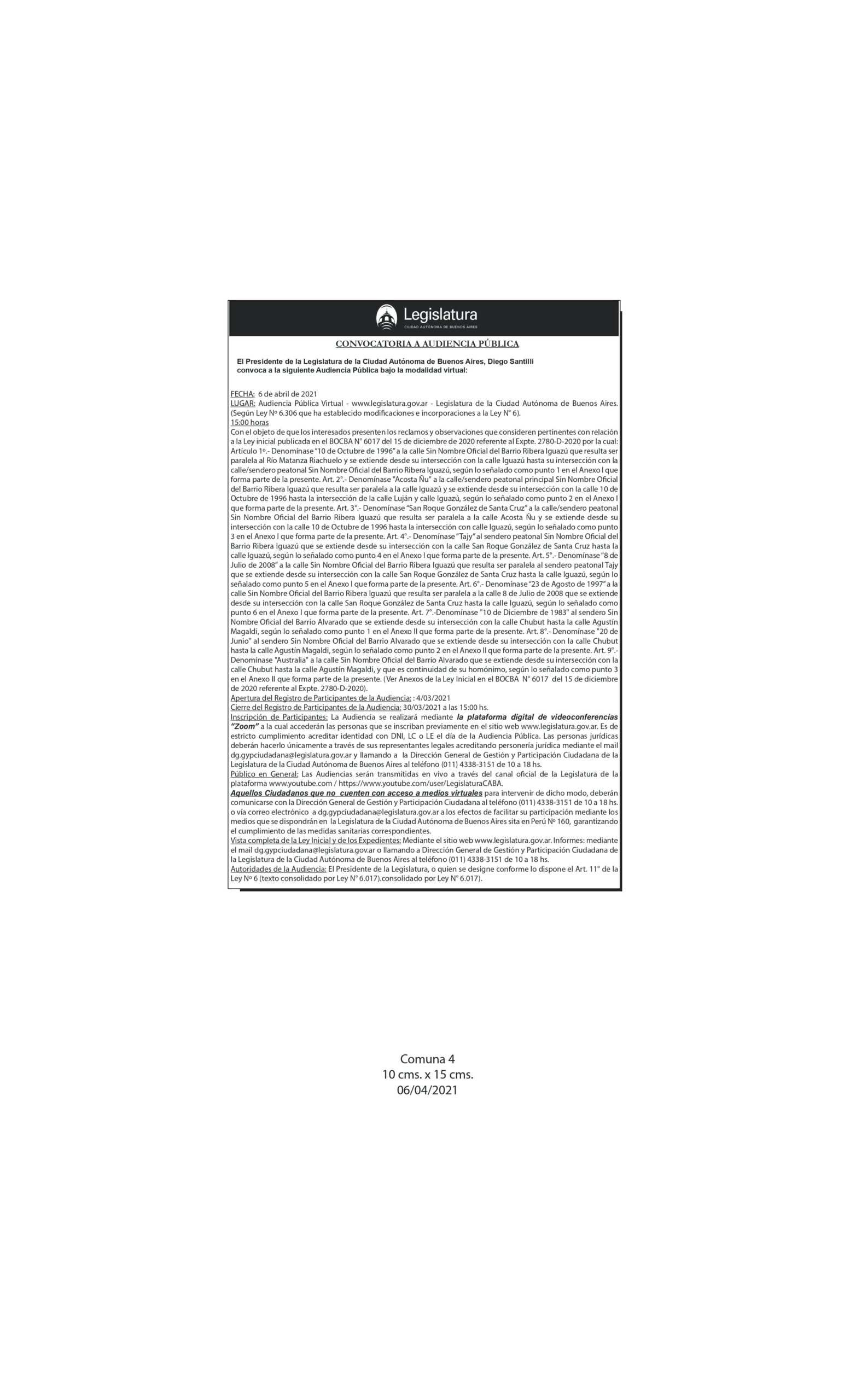 Con el objeto de que los interesados presenten los reclamos y observaciones que consideren pertinentes con relación a la Ley inicial publicada en el BOCBA N° 6017 del 15 de diciembre de 2020 referente al Expte. 2780-D-2020 por la cual: Artículo 1º.- Denomínase “10 de Octubre de 1996” a la calle Sin Nombre Ocial del Barrio Ribera Iguazú que resulta ser paralela al Río Matanza Riachuelo y se extiende desde su intersección con la calle Iguazú hasta su intersección con la calle/sendero peatonal Sin Nombre Ocial del Barrio Ribera Iguazú, según lo señalado como punto 1 en el Anexo I que forma parte de la presente. Art. 2°.- Denomínase “Acosta Ñu” a la calle/sendero peatonal principal Sin Nombre Ocial del Barrio Ribera Iguazú que resulta ser paralela a la calle Iguazú y se extiende desde su intersección con la calle 10 de Octubre de 1996 hasta la intersección de la calle Luján y calle Iguazú, según lo señalado como punto 2 en el Anexo I que forma parte de la presente. Art. 3°.- Denomínase “San Roque González de Santa Cruz” a la calle/sendero peatonal Sin Nombre Ocial del Barrio Ribera Iguazú que resulta ser paralela a la calle Acosta Ñu y se extiende desde su intersección con la calle 10 de Octubre de 1996 hasta la intersección con calle Iguazú, según lo señalado como punto 3 en el Anexo I que forma parte de la presente. Art. 4°.- Denomínase “Tajy” al sendero peatonal Sin Nombre Ocial del Barrio Ribera Iguazú que se extiende desde su intersección con la calle San Roque González de Santa Cruz hasta la calle Iguazú, según lo señalado como punto 4 en el Anexo I que forma parte de la presente. Art. 5°.- Denomínase “8 de Julio de 2008” a la calle Sin Nombre Ocial del Barrio Ribera Iguazú que resulta ser paralela al sendero peatonal Tajy que se extiende desde su intersección con la calle San Roque González de Santa Cruz hasta la calle Iguazú, según lo señalado como punto 5 en el Anexo I que forma parte de la presente. Art. 6°.- Denomínase “23 de Agosto de 1997” a la calle Sin Nombre Ocial del Barrio Ribera Iguazú que resulta ser paralela a la calle 8 de Julio de 2008 que se extiende desde su intersección con la calle San Roque González de Santa Cruz hasta la calle Iguazú, según lo señalado como punto 6 en el Anexo I que forma parte de la presente. Art. 7°.-Denomínase “10 de Diciembre de 1983” al sendero Sin Nombre Ocial del Barrio Alvarado que se extiende desde su intersección con la calle Chubut hasta la calle Agustín Magaldi, según lo señalado como punto 1 en el Anexo II que forma parte de la presente. Art. 8°.- Denomínase “20 de Junio” al sendero Sin Nombre Ocial del Barrio Alvarado que se extiende desde su intersección con la calle Chubut hasta la calle Agustín Magaldi, según lo señalado como punto 2 en el Anexo II que forma parte de la presente. Art. 9°.- Denomínase “Australia” a la calle Sin Nombre Ocial del Barrio Alvarado que se extiende desde su intersección con la calle Chubut hasta la calle Agustín Magaldi, y que es continuidad de su homónimo, según lo señalado como punto 3 en el Anexo II que forma parte de la presente. (Ver Anexos de la Ley Inicial en el BOCBA N° 6017 del 15 de diciembre de 2020 referente al Expte. 2780-D-2020).