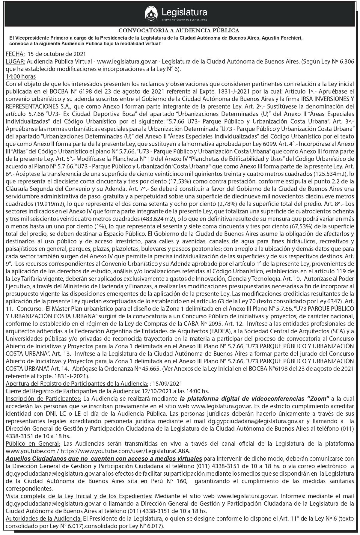 Con el objeto de que los interesados presenten los reclamos y observaciones que consideren pertinentes con relación a la Ley inicial publicada en el BOCBA N° 6198 del 23 de agosto de 2021 referente al Expte. 1831-J-2021 por la cual: Artículo 1o.- Apruébase el convenio urbanístico y su adenda suscritos entre el Gobierno de la Ciudad Autónoma de Buenos Aires y la rma IRSA INVERSIONES Y REPRESENTACIONES S.A., que como Anexo I forman parte integrante de la presente Ley. Art. 2o.- Sustitúyese la denominación del artículo 5.7.66 “U73- Ex Ciudad Deportiva Boca” del apartado “Urbanizaciones Determinadas (U)” del Anexo II “Áreas Especiales Individualizadas” del Código Urbanístico por el siguiente: “5.7.66 U73- Parque Público y Urbanización Costa Urbana”. Art. 3o.- Apruébanse las normas urbanísticas especiales para la Urbanización Determinada “U73 – Parque Público y Urbanización Costa Urbana” del apartado “Urbanizaciones Determinadas (U)” del Anexo II “Áreas Especiales Individualizadas” del Código Urbanístico por el texto que como Anexo II forma parte de la presente Ley, que sustituyen a la normativa aprobada por Ley 6099. Art. 4°.- Incorpórase al Anexo III “Atlas” del Código Urbanístico el plano N° 5.7.66. “U73 – Parque Público y Urbanización Costa Urbana” que como Anexo III forma parte de la presente Ley. Art. 5°.- Modifícase la Plancheta N° 19 del Anexo IV “Planchetas de Edicabilidad y Usos” del Código Urbanístico de acuerdo al Plano N° 5.7.66. “U73 – Parque Público y Urbanización ‘Costa Urbana’” que como Anexo III forma parte de la presente Ley. Art. 6o.- Acéptese la transferencia de una supercie de ciento veinticinco mil quinientos treinta y cuatro metros cuadrados (125.534m2), lo que representa el diecisiete coma cincuenta y tres por ciento (17,53%) como contra prestación, conforme estipula el punto 2.2 de la Cláusula Segunda del Convenio y su Adenda. Art. 7o.- Se deberá constituir a favor del Gobierno de la Ciudad de Buenos Aires una