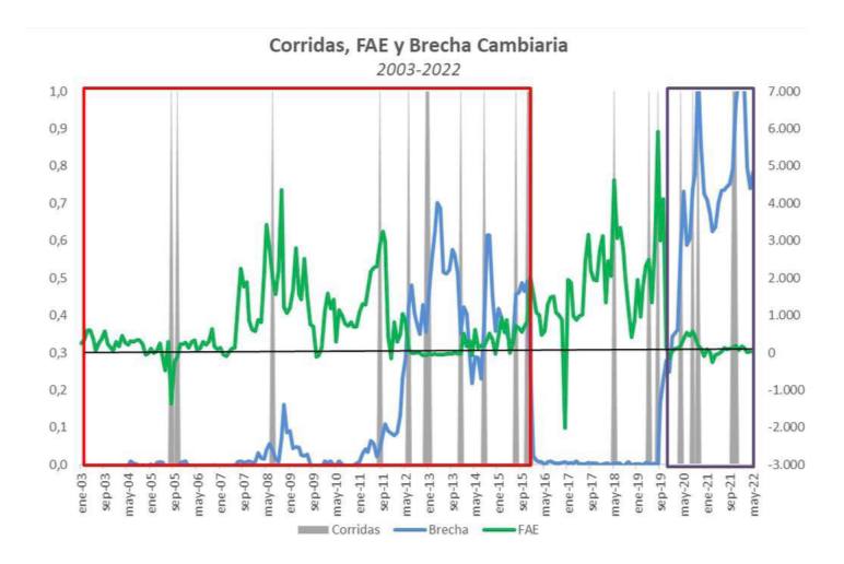 ¿Qué es una corrida cambiaria? Una corrida cambiaria es donde te apuestan para que: o devalúes y si no devaluás te ponen la brecha. ¿Qué es la brecha? Eso a que ustedes los atormentan todos los días en la televisión: a cuánto está el dólar blue, a cuánto está el contado con liqui, a cuánto está el MEP. Eso que uno se agarra y tiembla porque no sabe lo que le van a decir. Bueno, eso es la brecha. Cuando no pueden obligarte a devaluar te provocan la brecha. Yo hice, y es notable ver toda la serie, toda la serie desde el año 2003 al año, ahora al 2022. ¿Cómo se produce? Lo verde es la formación de activos en el exterior: o sea dólares que se van afuera del país y obviamente se sustraen a la economía. Lo azul es la brecha, esto que les dije recién, que el dólar blue subió, que el contado con liqui subió, que se va todo al demonio, que pin, que pum, que pam. Y las cosas grises estas son las corridas. Si uno mira completo la serie, si uno mira completo la serie observa que hubo formación de activos en nuestro gobierno, que la formación de activos, en mi primer gobierno fundamentalmente, hasta la regulación cambiaria. Esto es importante porque lo celestito es el tema de la brecha que se produce siempre cuando hay regulación cambiaria. ¿Qué es esto? Que no se los deja acceder libremente a los dólares que se les da la gana en el mercado único y libre de cambios.