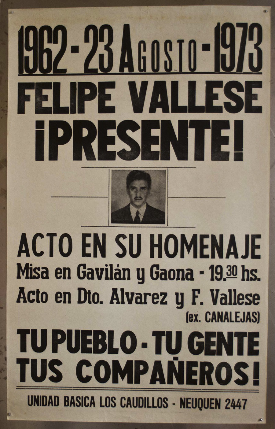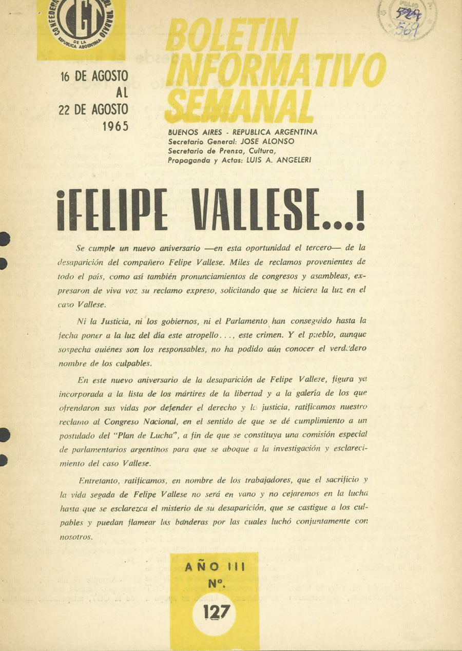 Como núcleo problemático final proponemos retomar la esencia misma de la persona recordada. Felipe Vallese fue un trabajador metalúrgico y un delegado sindical hasta el último día de su vida. La centralidad que toma la organización gremial en los lugares de trabajo y las figuras del delegado, los cuerpos de delegados y las comisiones internas en la historia argentina reciente no pueden ser omitidas para comprender las diferentes etapas de las luchas nacionales como de la lucha de clases interna. Si durante el peronismo “el lugar de trabajo es el espacio de autonomía donde la clase obrera defiende el resultado de su victoria política”, como define Rafael Cullen en su libro Clase obrera, lucha armada, peronismos, durante la resistencia peronista y más aún desde 1960 en adelante, será el núcleo de donde emanen las mayores demostraciones de resistencia y organización popular. En esta línea, el Plan de Lucha de la CGT entre 1963 y 1965, con la toma de fábricas como metodología de lucha, fue el cenit de este proceso. Para comprender lo problemático que era para las patronales el protagonismo de la organización sindical en los lugares de trabajo, mediante delegados y comisiones internas, Victoria Basualdo en su ensayo Los delegados y las comisiones internas en la historia argentina incluye la opinión del Subsecretario de Trabajo del gobierno de Frondizi, Galileo Puente quien manifestaba haber encontrado “anarquía, abusos y extralimitaciones de todo orden de los obreros. Los empresarios habían perdido el comando de las fábricas, todo lo disponían las comisiones internas; mandaban los que tenían que obedecer […] los empresarios deben retomar el control de las fábricas.” Este panorama expone la dimensión del poder de los delegados y las comisiones internas. Felipe Vallese es elegido delegado con solo 18 años, a escasos meses de haber ingresado a la fábrica. En su periodo como representante sindical logra una importante cantidad de conquistas para los trabajadores: “ropa de trabajo, rigurosos cumplimientos del horario y pagos de las horas extras, cofres para vestuarios, leche por trabajo insalubre”, entre otras, según enumera Barraza en sus crónicas periodísticas. Este Vallese no fue solo un protagonista forzado en la escena nacional, sino que principalmente lo fue en el núcleo fundante del poder obrero de aquellos años: ser un militante orgánico de su sindicato pero más aún ser un delegado de sus compañeros, intachable, ético, trabajador y, por sobre todas las cosas, que aplicara ese poder sindical. Su secuestro y desaparición son el reverso de ese protagonismo en el tejido social y político. Se elimina al que integra y amalgama a la comunidad. Verdaderamente un preludio de lo que será 14 años después con miles de dirigentes, delegados y activistas sindicales detenidos-desaparecidos.