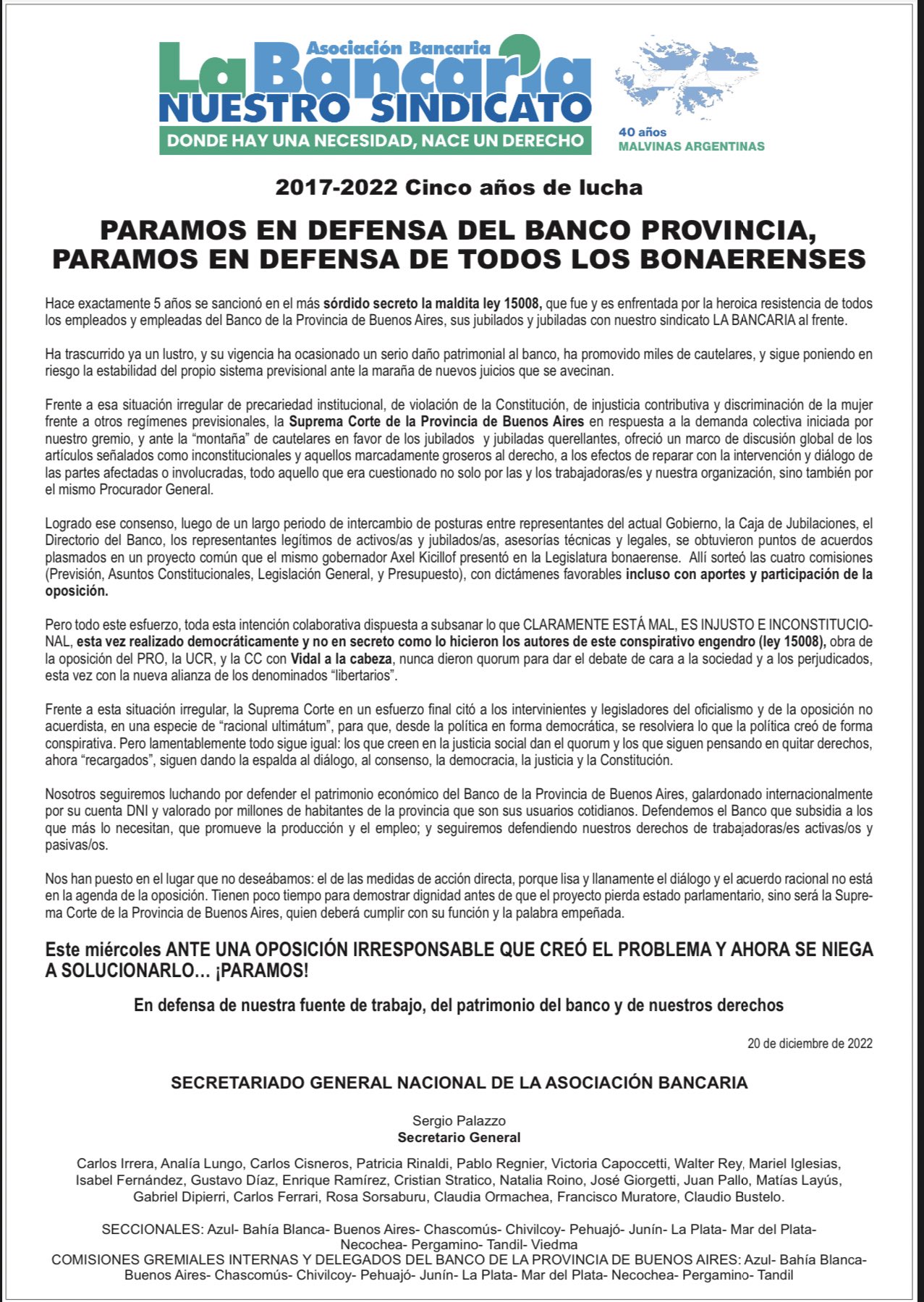 A 5 años de la sanción de la “maldita ley 15.008” que introdujo cambios regresivos en las jubilaciones de los trabajadores del Banco Provincia, la Asociación Bancaria realizará un paro de actividades en la entidad este miércoles 21 de diciembre.