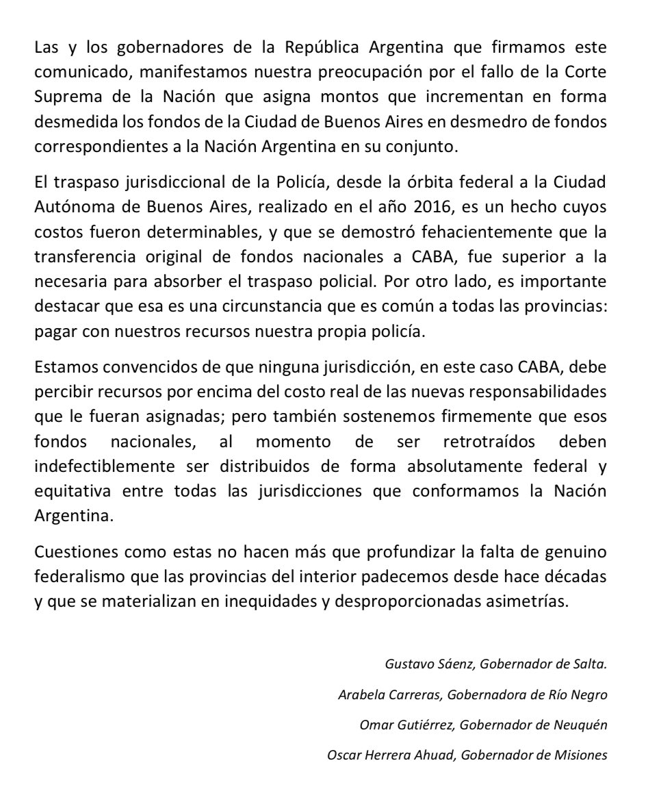 Inclusive tuvo el apoyo de 18 gobernadores que en un comunicado conjunto fustigaron la decisión de una Corte que decidió intervenir abiertamente en la política en el último período. De las provincias gobernadas por el peronismo (en un sentido amplio del término) no acompañaron la decisión ni Córdoba ni Santa Fe, gobernadas por Juan Schiaretti y Omar Perotti, respectivamente.