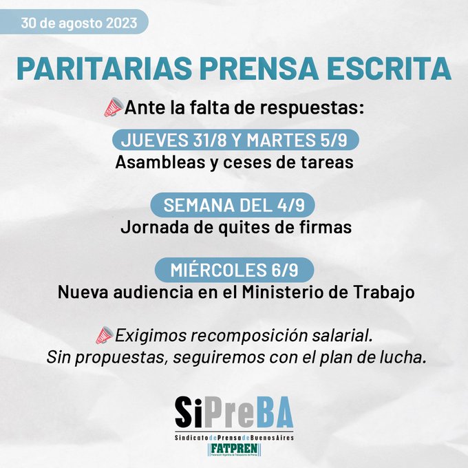 Dentro del plan de lucha están planteadas asambleas de los trabajadores de prensa escrita -incluye diarios, agencias de noticias, portales digitales y revistas- para este jueves 31 de agosto y martes 5 de septiembre. Para la próxima semana habrá una quita de firmas por parte de los trabajadores.