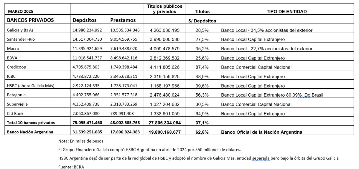 Pero de los 61 bancos privados, a marzo 2025 (último dato publicado por el BCRA) son 9 (nueve) los que captan el 49,31% de las imposiciones de todo el sistema financiero legal, que si le sumamos al Banco de la Nación Argentina (que capta el 20,71%) representan el 70,02%, a marzo 2025 significan 106,6 billones de pesos, (equivalente en dólares a unos 82.000 millones de dólares), y a su vez dichas entidades poseen títulos públicos por 47,6 billones de pesos (equivalente a unos 37.000 millones de dólares) que significa el 45% del total de los depósitos captado por las nueve entidades privadas y el Banco de la Nación Argentina.