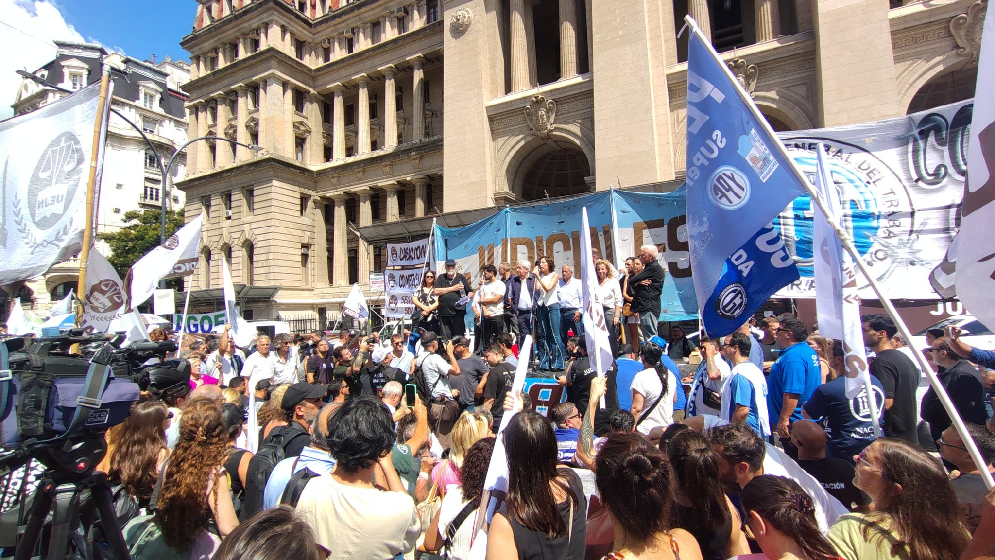 También dialogó con Radio Gráfica, Mara Fernández, secretaria Gremial de la Unión de Empleados de la Justicia de la Nación (UEJN), sindicato que activó una serie de protestas con la toma de edificios desde el lunes, un paro de 48 hs. y una concentración este martes a la puerta de la Corte Suprema de Justicia reclamando la inconstitucionalidad del traspaso. La protesta tuvo el acompañamiento de dirigentes como Sergio Palazzo (Bancarios) y Jorge Sola (CGT).