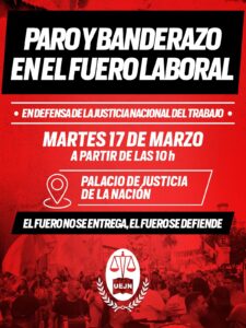 Más allá de las acciones concretas que tienen que ver con que se determine esa inconstitucionalidad de la que hablaba y que eso se tendrán que pronunciar los jueces, desde la Unión de Empleados de la Justicia de la Nación decretamos la emergencia del fuero del trabajo, vamos a estar manifestándonos y movilizándonos el martes 17-3 con un paro a partir de las 10 am. Vamos a ir al Palacio de Justicia en defensa del fuero, en defensa de la independencia del poder judicial, en defensa de la independencia de los magistrados de la justicia nacional del trabajo. Vamos a seguir desplegando las medidas de fuerza como lo venimos haciendo desde que conocimos la firma del nefasto decreto que habilitó al jefe de gabinete de ministros a firmar transferencias de competencias del fuero nacional a la justicia de la ciudad y extralimitándose, determinó la disolución del fuero y el traspaso de parte de lo que es materia federal a contencioso administrativo.