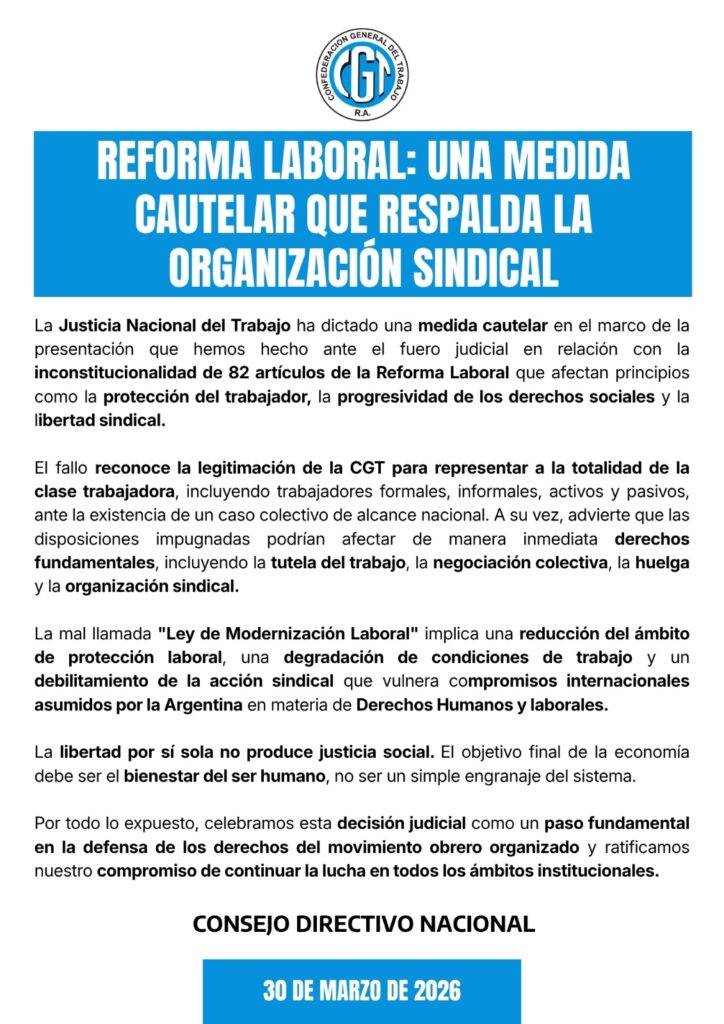Asimismo advirtió que establecería “modificaciones peyorativas y permanentes en los derechos individuales y colectivos de los trabajadores y sus organizaciones sindicales en los institutos del marco legal individualizados que hasta su sanción garantizan el principio protectorio y la libertad sindical“.