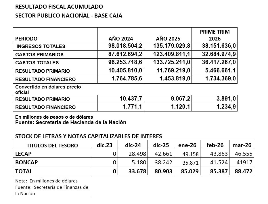 Y para el primer trimestre 2026, el superávit primario acumulado fue de un equivalente a 3.891 millones de dólares, pero se capitalizaron intereses por 7.569 millones de dólares que, de haberse pagado, significa un déficit fiscal de 3.678 millones de dólares.